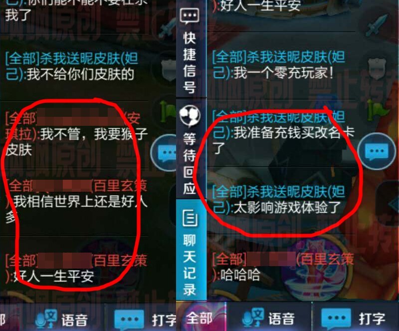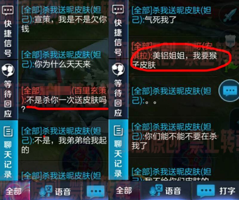 我們可以看到這個妹子的ID為“殺我送昵(你)皮膚”。相信很多人看到這個皮膚都想去擊殺她,如果是真的話,自己可以得到皮膚。也正因為如此,自己經(jīng)常在游戲當(dāng)中被人給”群毆“ 。通過聊天記錄我們可以看到,對方的打野經(jīng)常去中路抓,甚至對方安琪拉都說出了自己想要的皮膚。